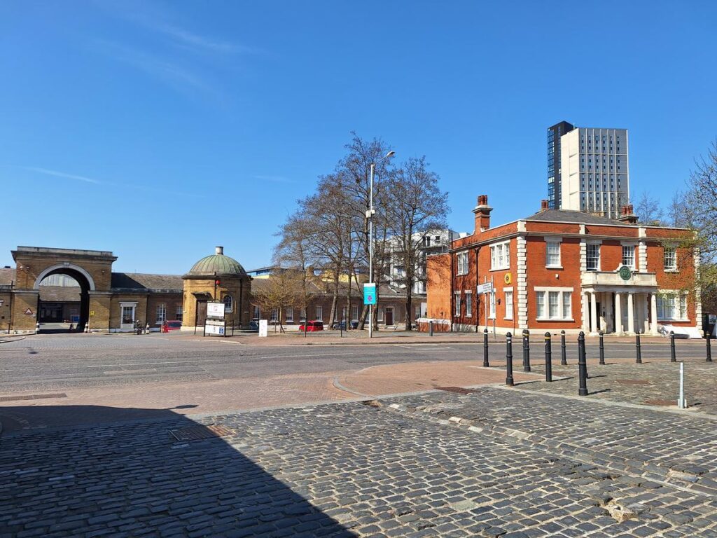 Junto al muelle se encuentran las puertas originales y muros de ladrillo de la antigua entrada principal al complejo de muelles, construida en los primeros años del siglo XIX al mismo tiempo que el North Dock. Aún conserva los viejos rieles y caminos adoquinados para los carros de mercancías, lo que nos permite imaginar el bullicio de los trabajadores que entraban y salían cada día para manejar esas enormes cantidades de mercancías.