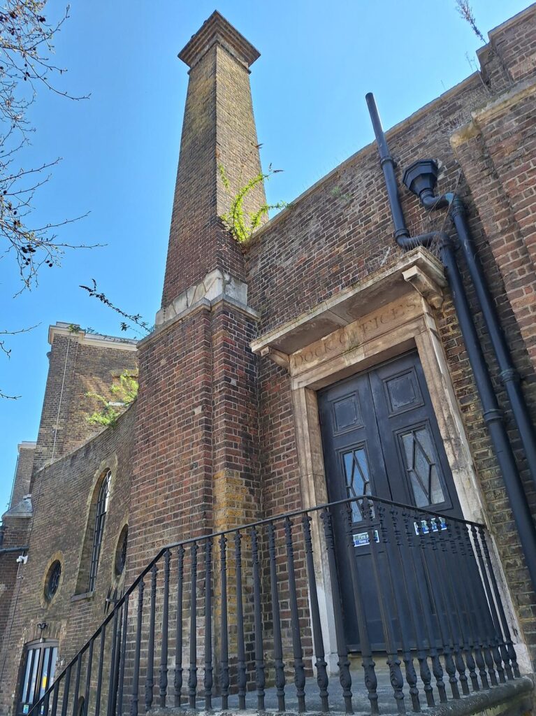 Al lado encontramos las antiguas oficinas de los muelles, como el grabado encima de la puerta aún recuerda Dock Offices, construidas a principios del siglo XIX a la vez que la entrada a los muelles. Desde aquí controlaban la carga y descarga de mercancías, los registros de barcos, los pagos de tasas portuarias y la coordinación de trabajadores.