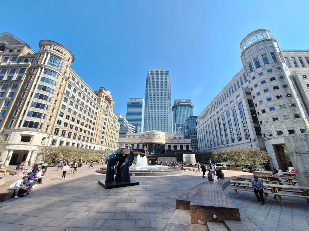 De camino entramos otra área más moderna de Canary Wharf coronada por Cabot Square, una plaza con mucho espacio para sentarse y relajarse, con el elemento del agua también presente gracias a la fuente central.
