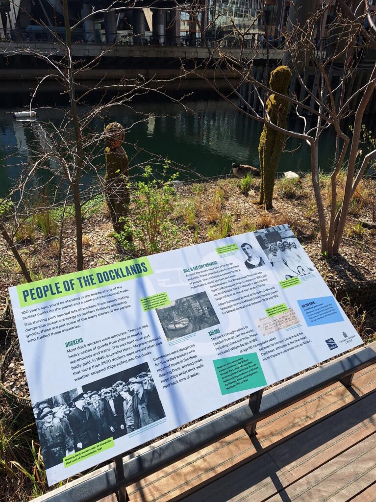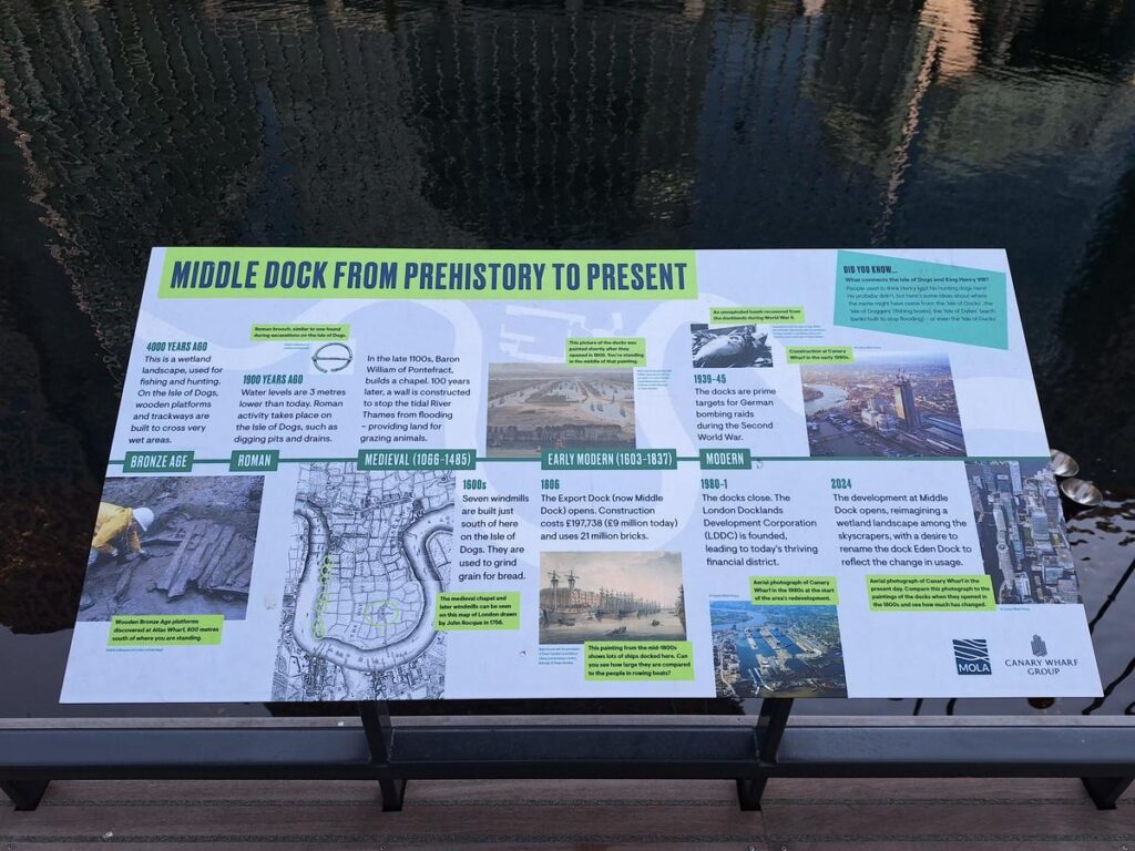 Otro panel nos cuenta más sobre la historia del lugar. Empezando desde la Edad de Bronce que datan unas piezas de madera encontradas para cruzar estas tierras entonces pantanosas, pasando por la Edad Media cuando una barrera de madera a lo largo del río Támesis evitaba que se desbordara y así poder utilizar estas tierras como pasto para animales. Y ya más recientemente, con la llegada de la Segunda Guerra Mundial estos muelles fueron uno de los blancos principales de las bombas enemigas para intentar dañar la industria del país.