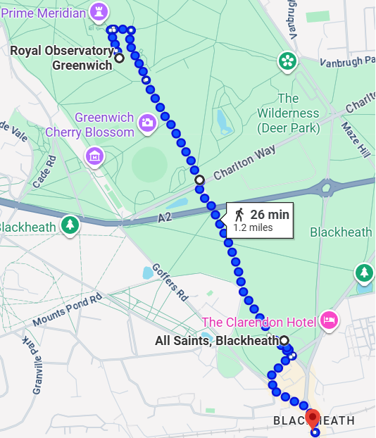 En este paseo iremos directamente hacia el edificio que predomina en lo alto, el Real Observatorio de Greenwich, construido por el ya mencionado arquitecto Christopher Wren en 1675. Es el lugar de origen del famoso Meridiano de Greenwich, por donde cruza la línea imaginaria que divide el hemisferio oriental y occidental.
