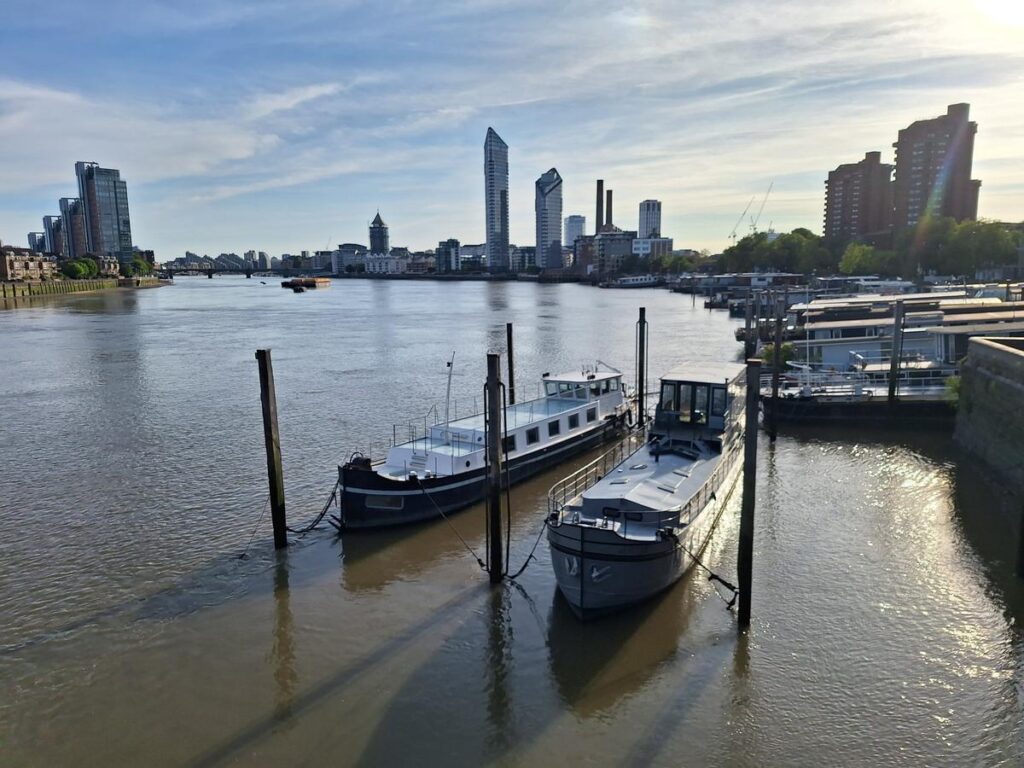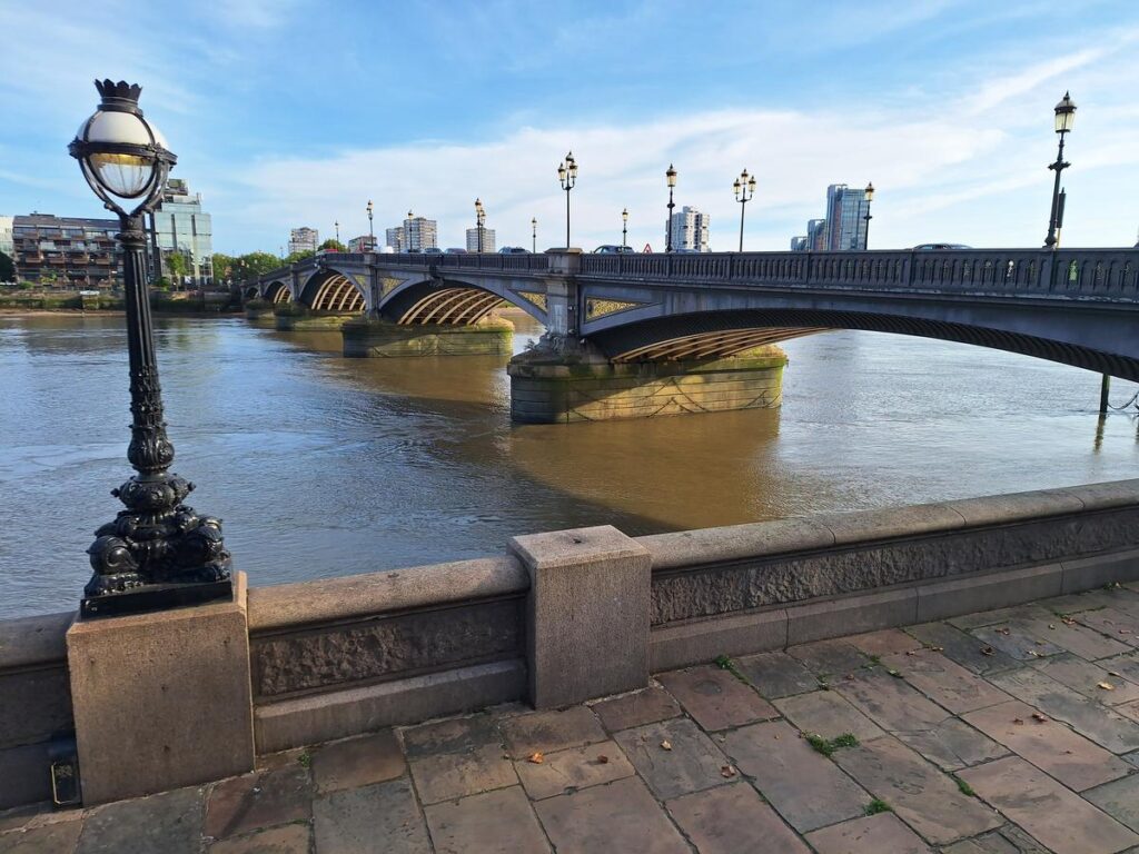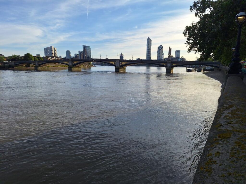 Empezamos con una vista panorámica del río Támesis desde Battersea Bridge, con un pequeño muelle a un lado y barcos amarrados que le dan un aspecto pintoresco. Este puente fue pintado en diversos cuadros por varios artistas durante siglos, incluido el pintor inglés J.M.W. Turner del que hablaremos más adelante.