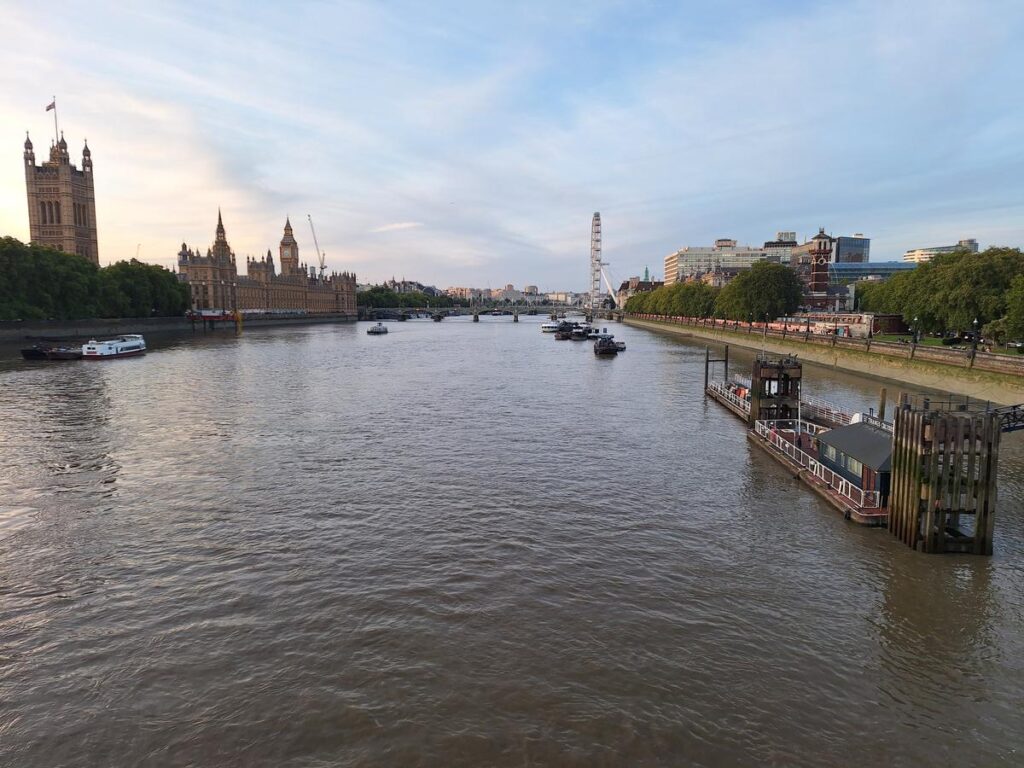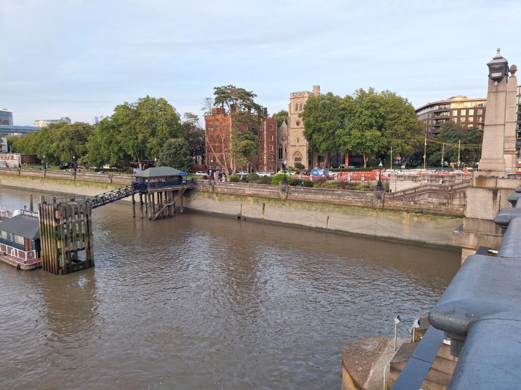 Las vistas desde el puente son preciosas, con su pequeño muelle en medio del poderoso río Támesis. Esta es una vista que esperaríamos encontrar más en el mar que en un río, lo cuál nos recuerda que el Támesis es aún hoy en día un río navegable y muy transitado por barcos de todo tipo como veremos durante el paseo.
