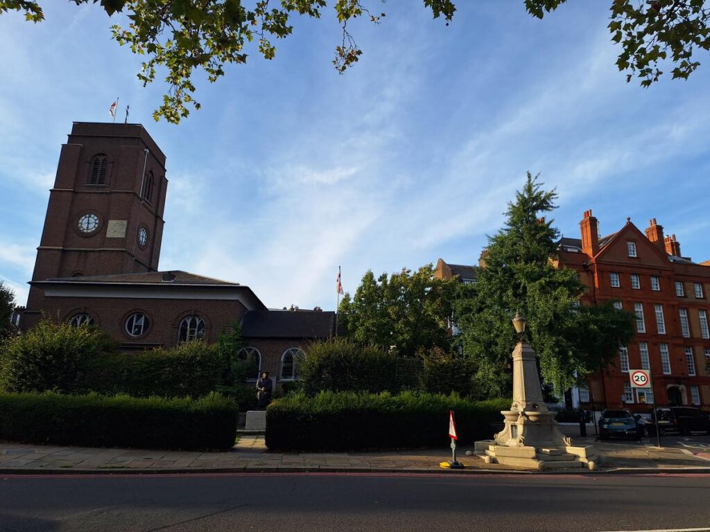 Enseguida encontramos Chelsea Old Church, la vieja iglesia del barrio de Chelsea, aunque hoy en día conserva poco de su estructura original debido a los bombardeos que Londres sufrió durante la Segunda Guerra Mundial. Aún así, aún conserva algunas partes del edificio original del siglo XIII, como el presbiterio y algunas capillas.