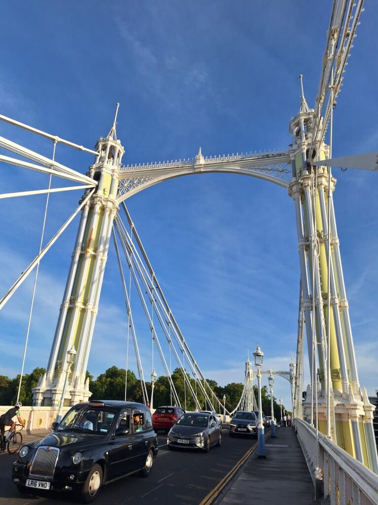 Enseguida se deja ver el siguiente de los puentes que encontraremos a lo largo del río. Se llama Albert Bridge y fue abierto en 1873 como puente de peaje, pero tras su fracaso comercial pasó a ser gratuito.