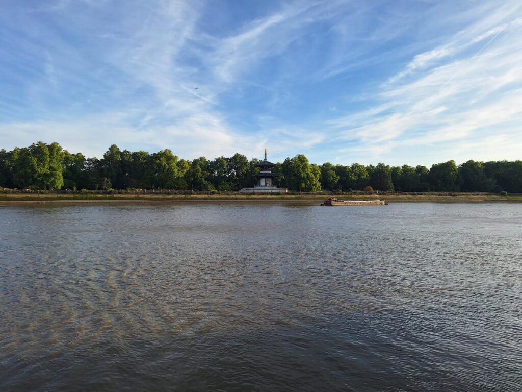En la orilla opuesta podemos ver la London Peace Pagoda, situada en uno de los muchos y fantásticos parques que tiene Londres llamado Battersea Park.